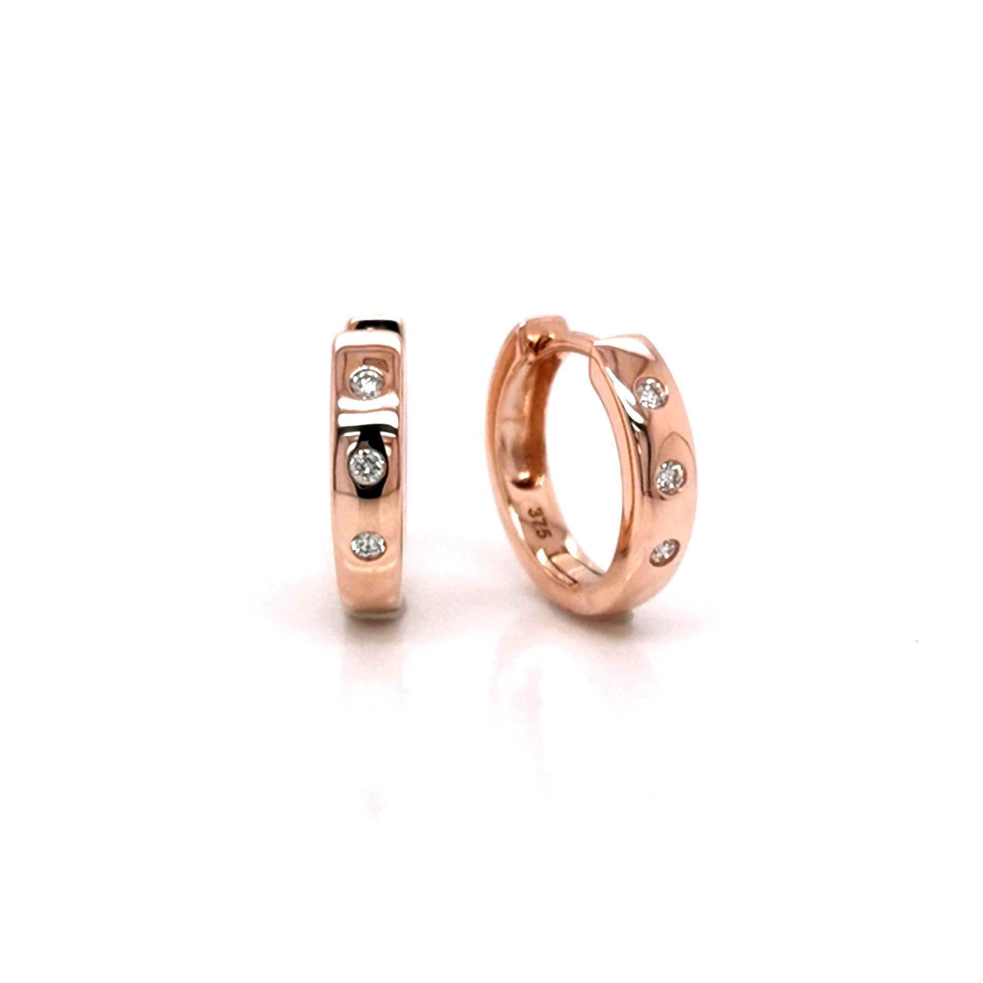 9RG 12MM GYPSY SET HUGGIE EARRINGS SET WITH RBC 6=0.06CT WH PQ