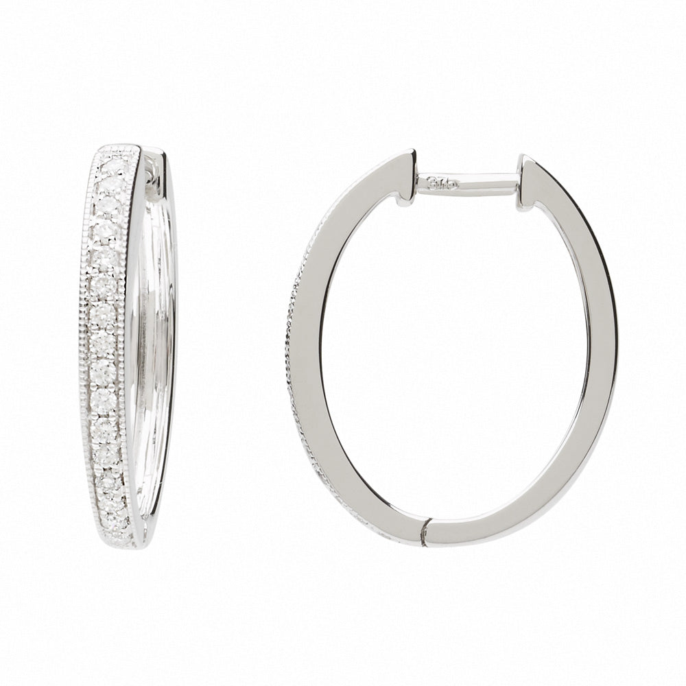 9WG 20x16MM OVAL PROFILE GRAIN SET MILLGRAIN HUGGIE EARRINGS WITH RBC 32=0.25CT WH PQ