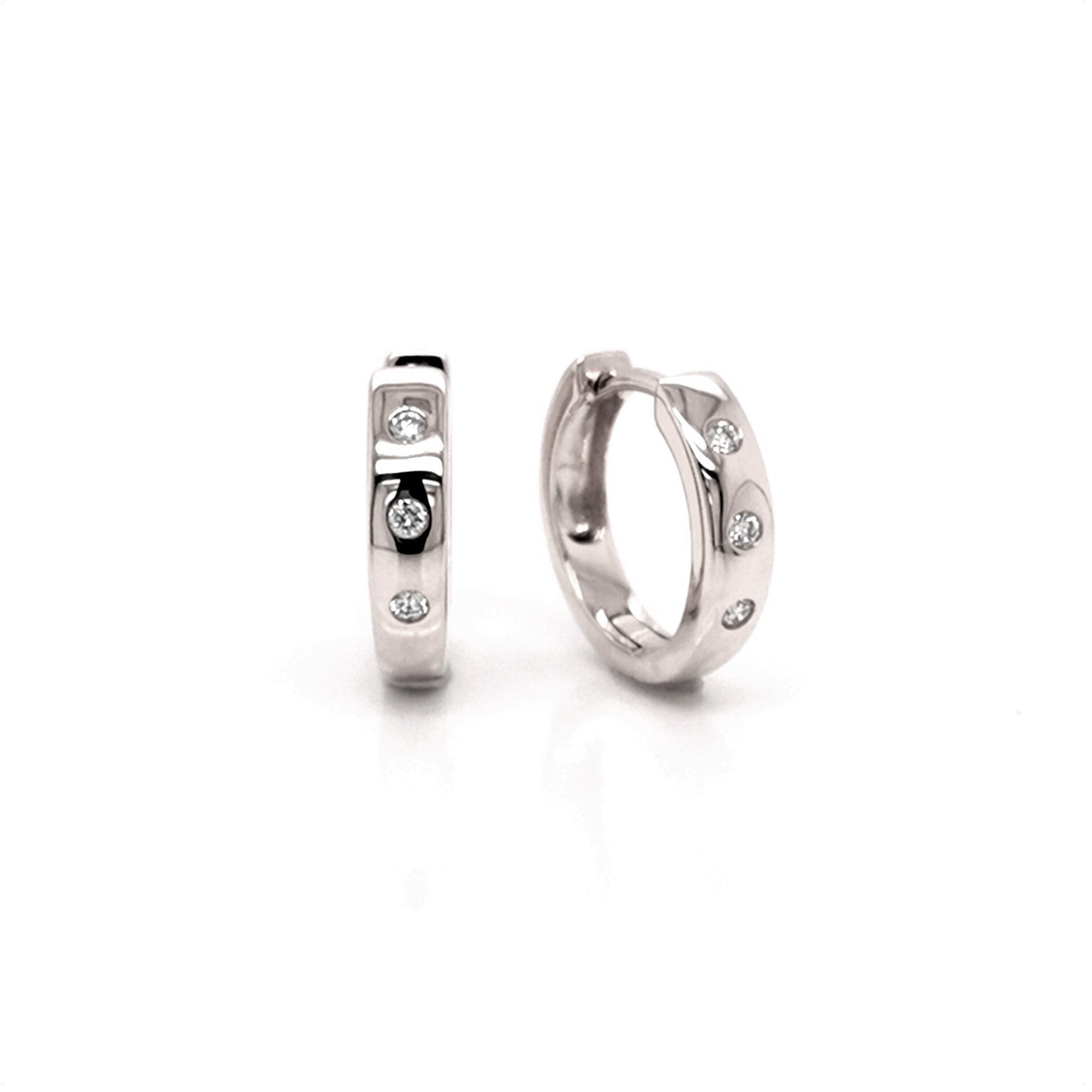 18WG 12MM GYPSY SET HUGGIE EARRINGS SET WITH RBC 6=0.06CT WH SI