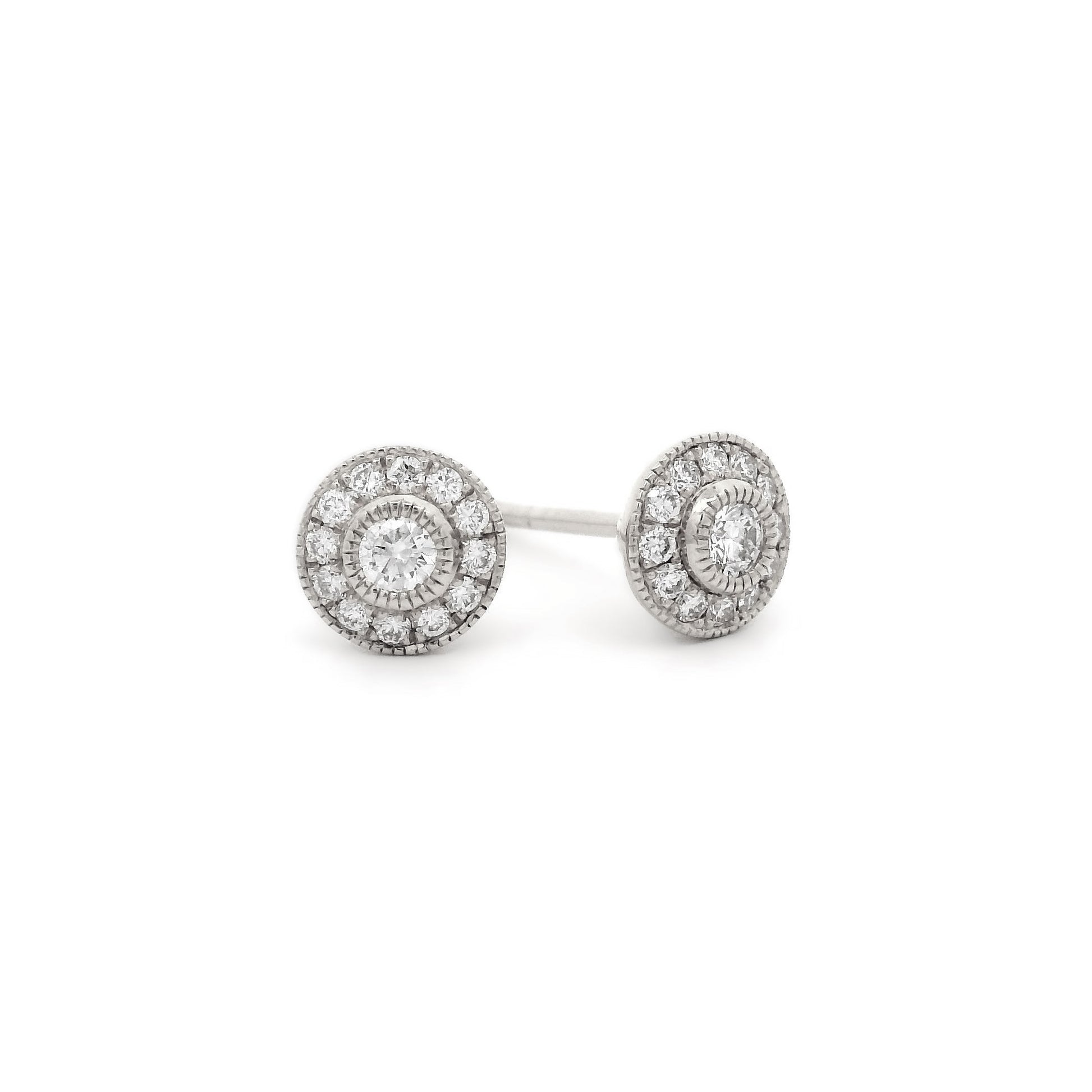 18WG HALO STUD EARRINGS WITH MILLGRAIN SET WITH RBC 26=0.22ct WH SI