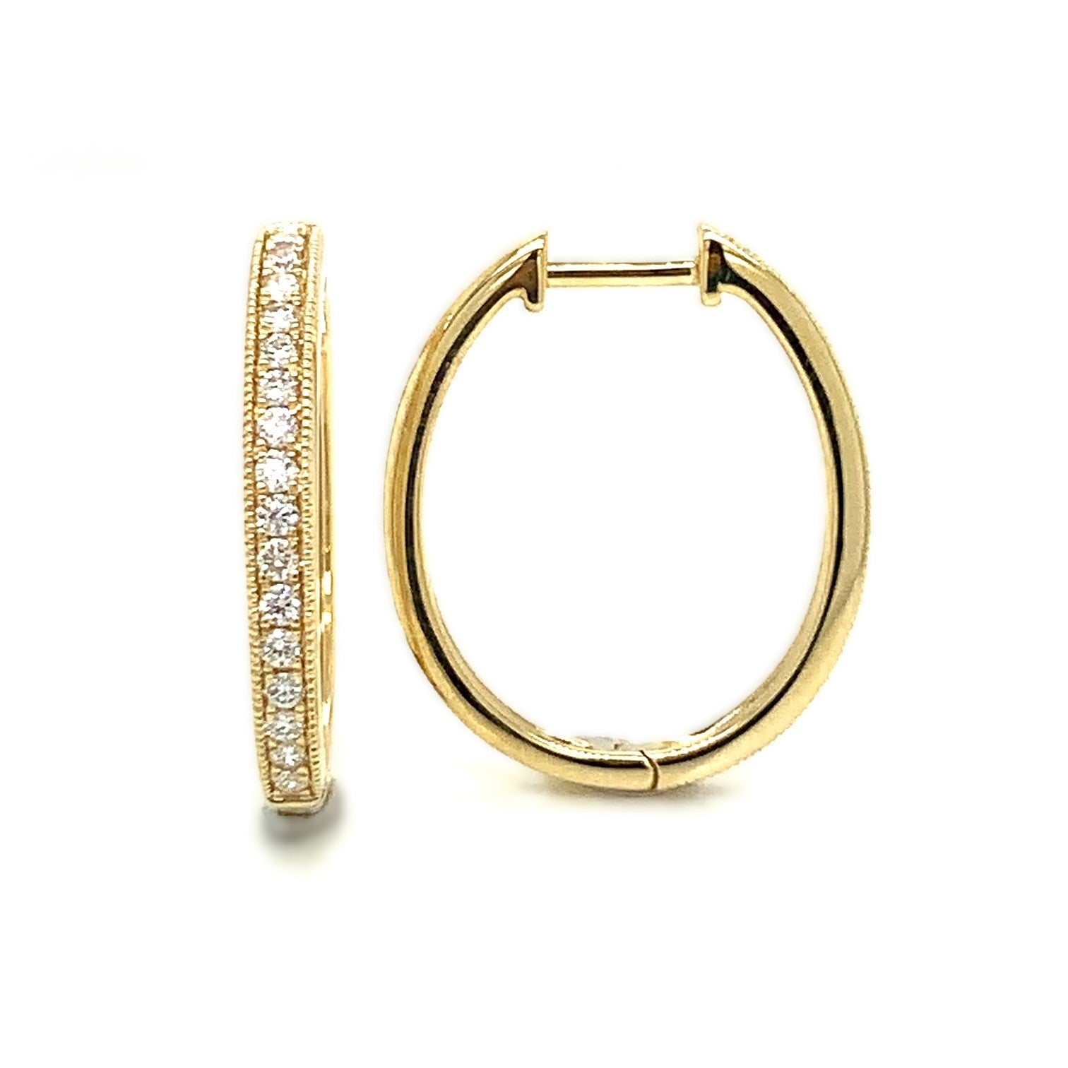 9YG 20x16MM OVAL PROFILE GRAIN SET MILLGRAIN HUGGIE EARRINGS WITH RBC 32=0.25CT WH PQ