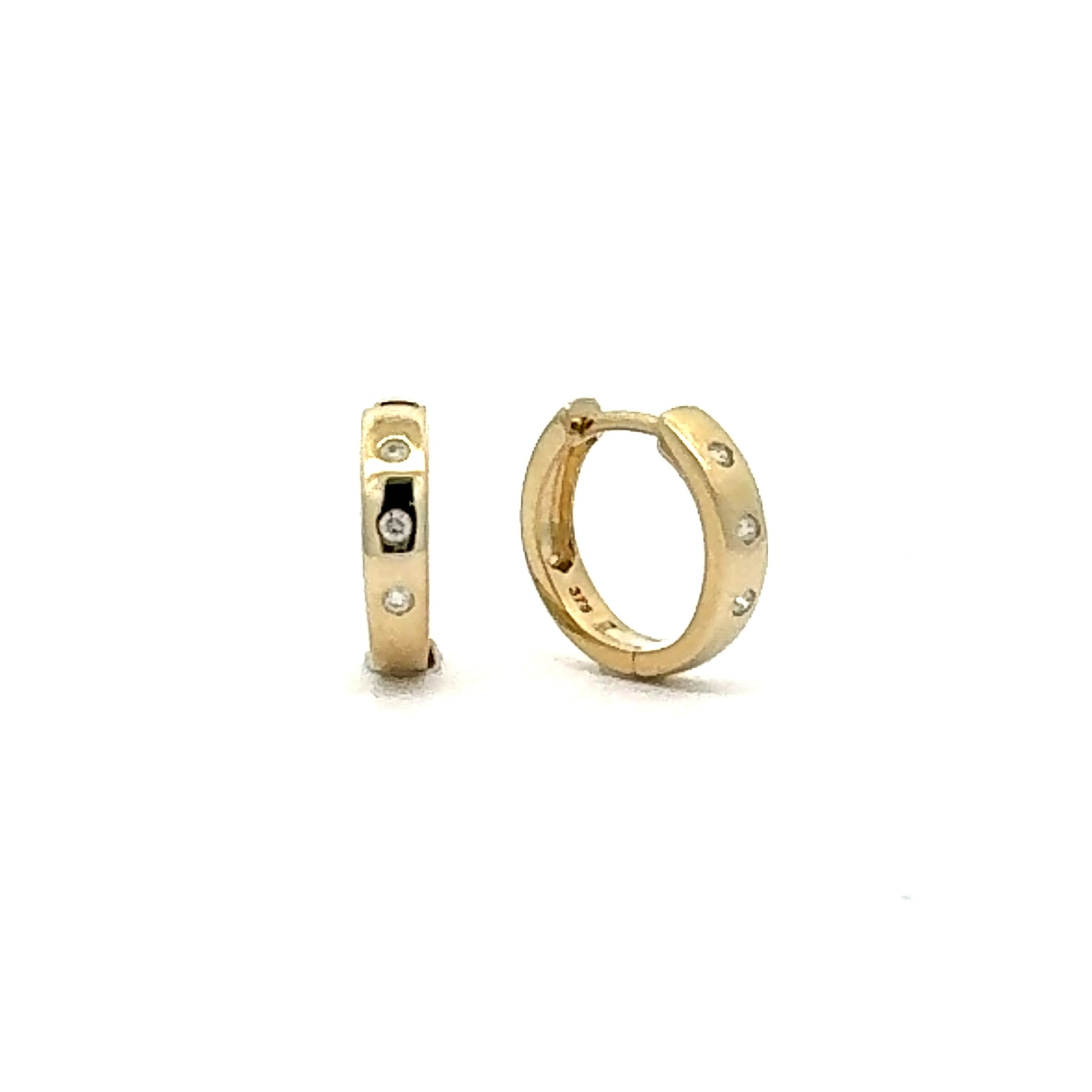 9YG 12MM GYPSY SET HUGGIE EARRINGS SET WITH RBC 6=0.06CT WH PQ
