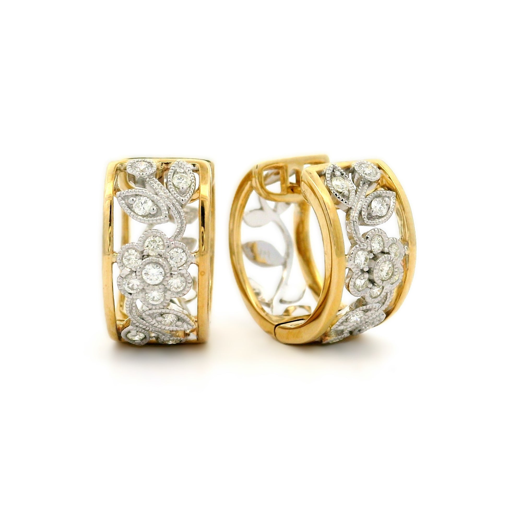 9YWG OPEN FILIGREE FLORAL HUGGIE EARRINGS SET WITH RBC 26=0.35CT OW PQ