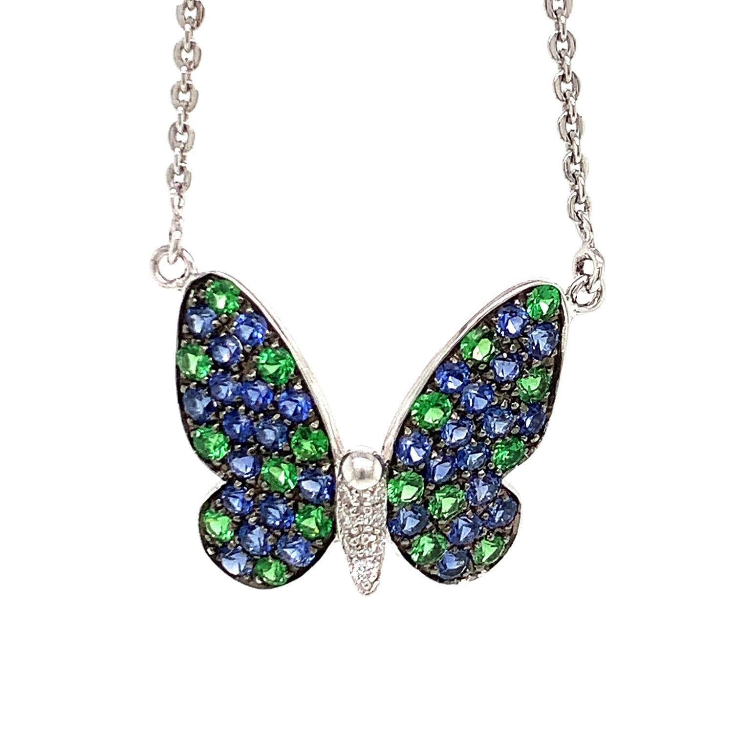 **LAST ONE** 18CT WG PAVE SET BUTTERFLY NECKLACE WITH BLUE SAPPHIRES =1.13CT TSAVORITE GARNETS=0.67CT AND DIAMONDS 7=0.08CT FG VS