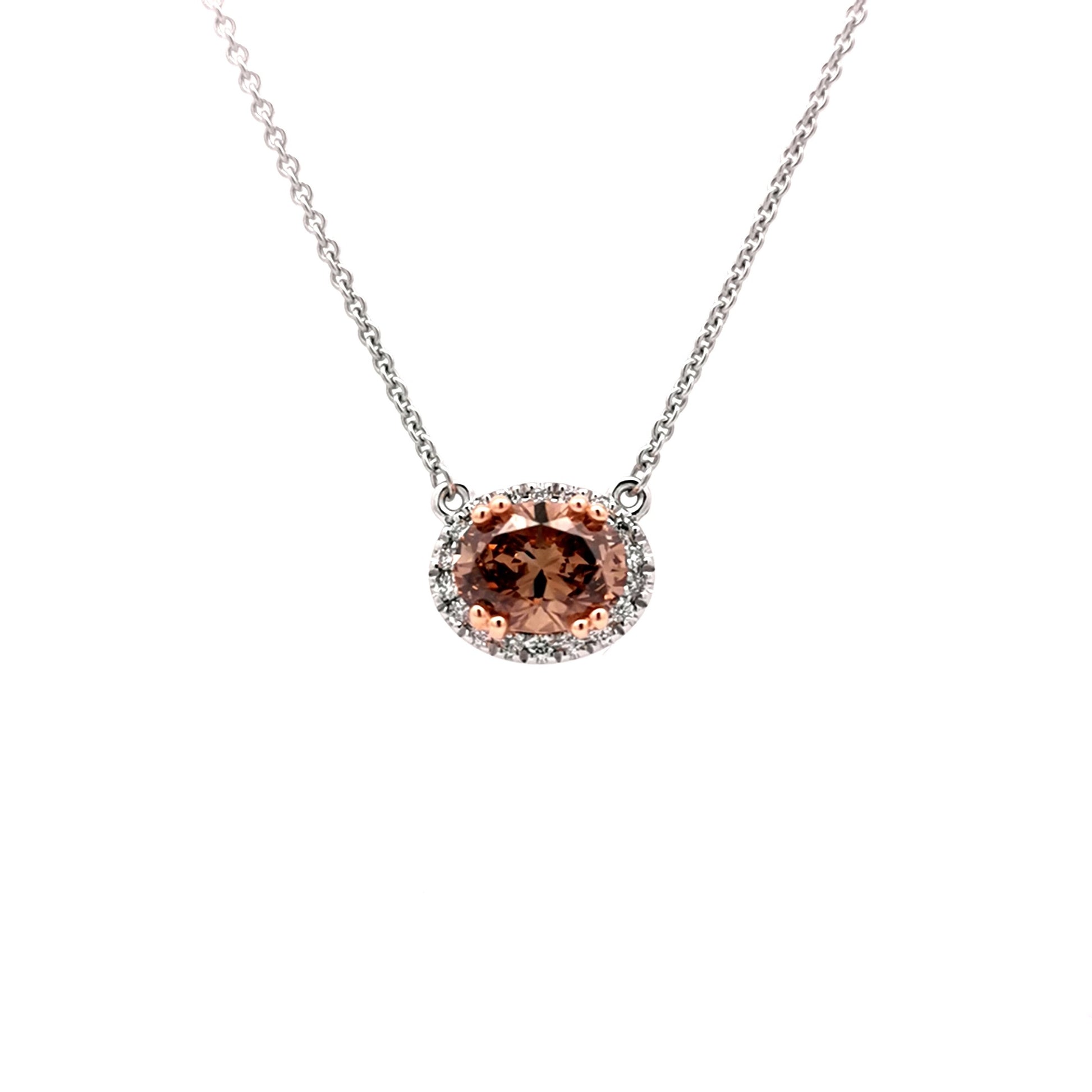 18WRG FIXED HORIZONTAL FINE HALO NECKLACE WITH CHAMPANGE OVAL 1=1.02CT C5 VS2 (2109074) & RBC 18=0.07CT NCL ARGYLE#459532 **18WG ITALIAN ADJUSTABLE CHAIN 42-45CM**