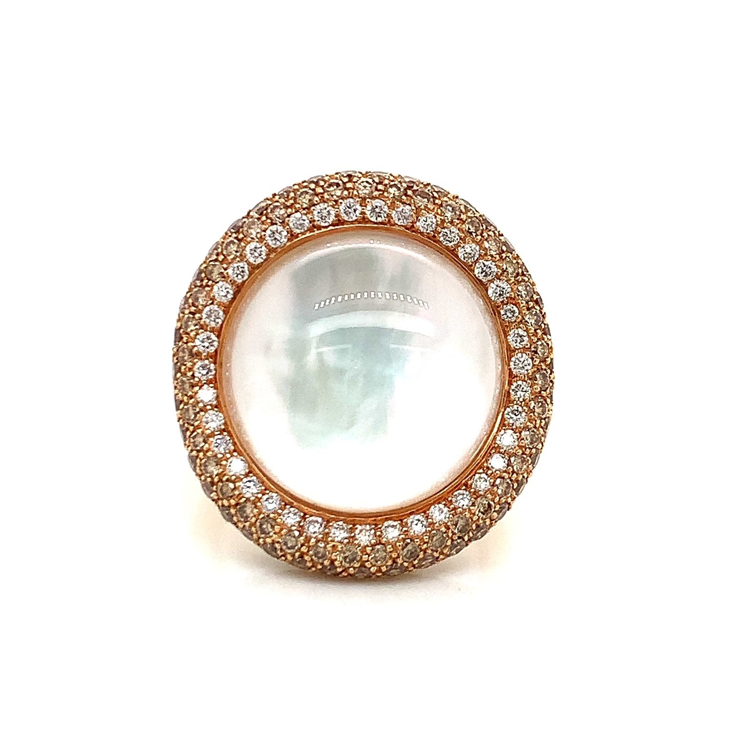 **LAST ONE** 18RG PAVE SET COCKTAIL RING WITH 16MM RND MOP 3.40CT WHITE QUARTZ CABOCHON 11.18CT FG VS 40=0.33CT AND 114=1.76CT BROWN DIAMONDS