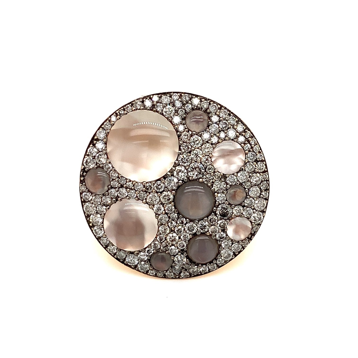 **LAST ONE** 18RG 27MM RND RING MULTIPLE FANCY CUT RND GREY MOONSTONE 1.49CT AND WHITE MOONSTONE 4.93CT WITH PAVE SET GREY SHEEN DIAMONDS (NATTS) =1.96CT