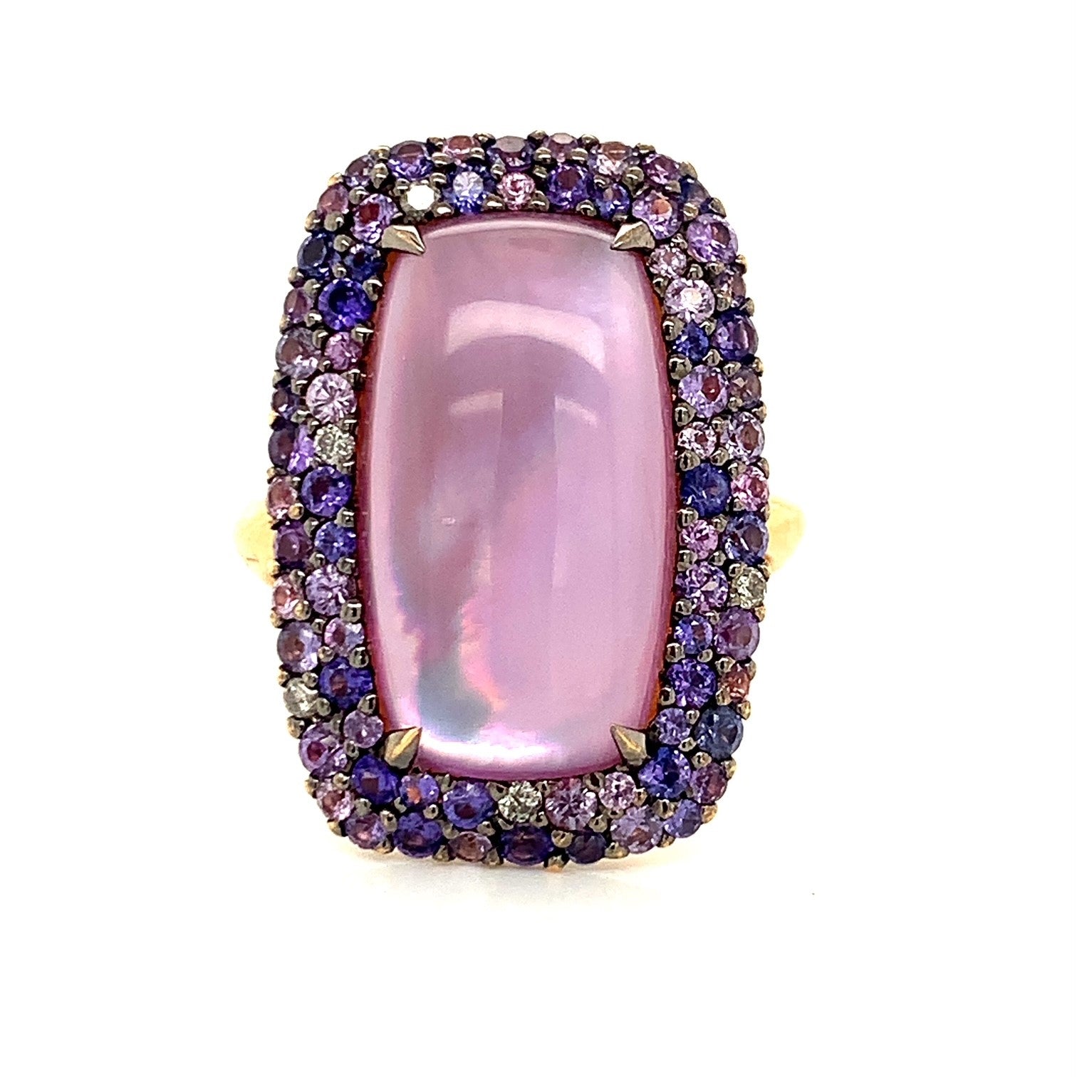 **LAST ONE** 18RG RING 4.50ct AMETHYST & 2.24ct MOTHER OF PEARL CENTRE SURROUNDED BY 1.25ct ROUND PURPLE SAPPHIRES & .05ct SILVER DIAMONDS