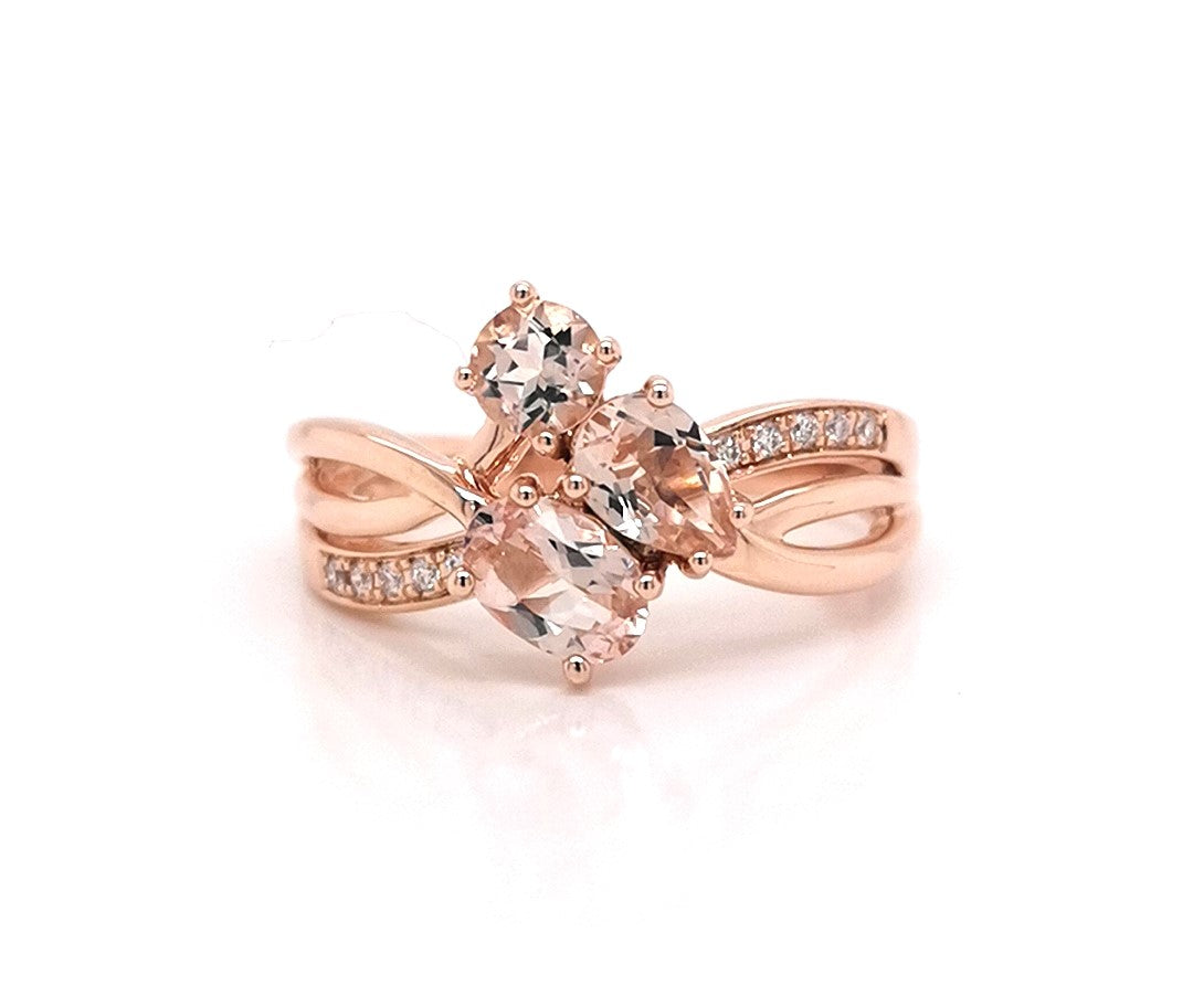 9RG MULTI SHAPE MORGANITE RING WITH SWIRL BAND SET WITH RBC 10=0.05CT WH PQ & PEAR, OVAL AND ROUND MORGANTIES