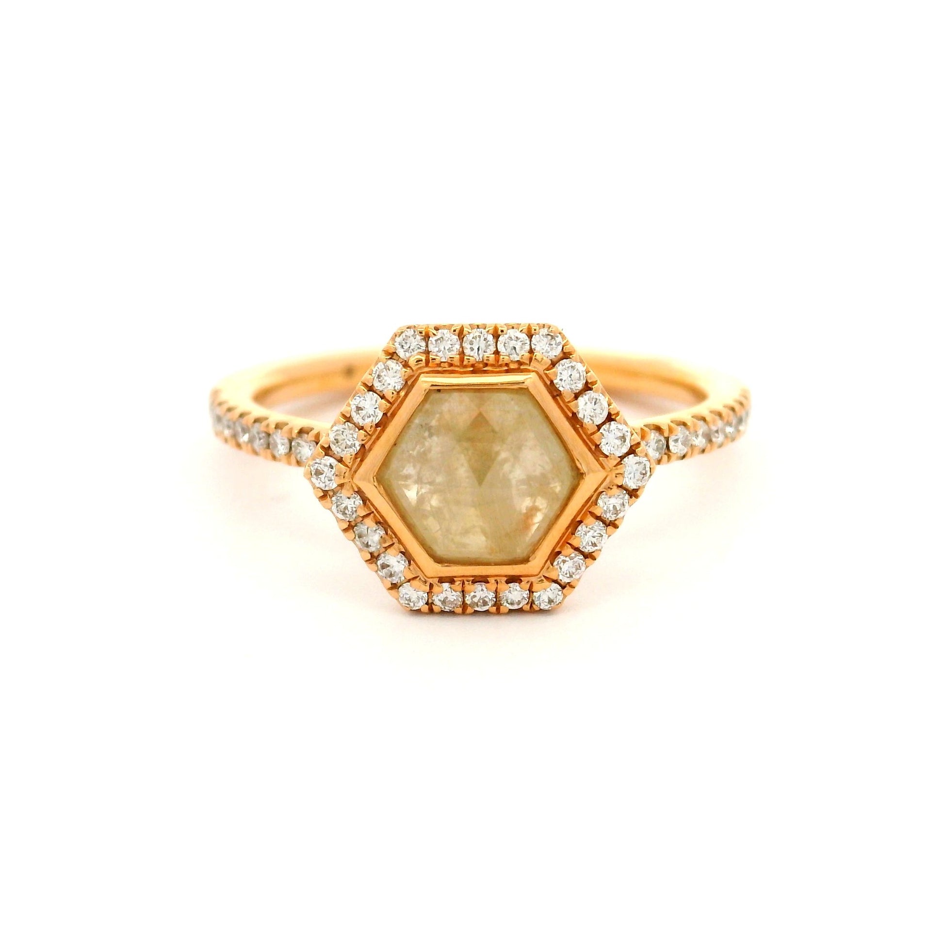 18RG HEXAGON DIAMOND SLICE RING 1=0.63CT WITH RBC HALO/SHOULDERS 42=0.23CT WH SI