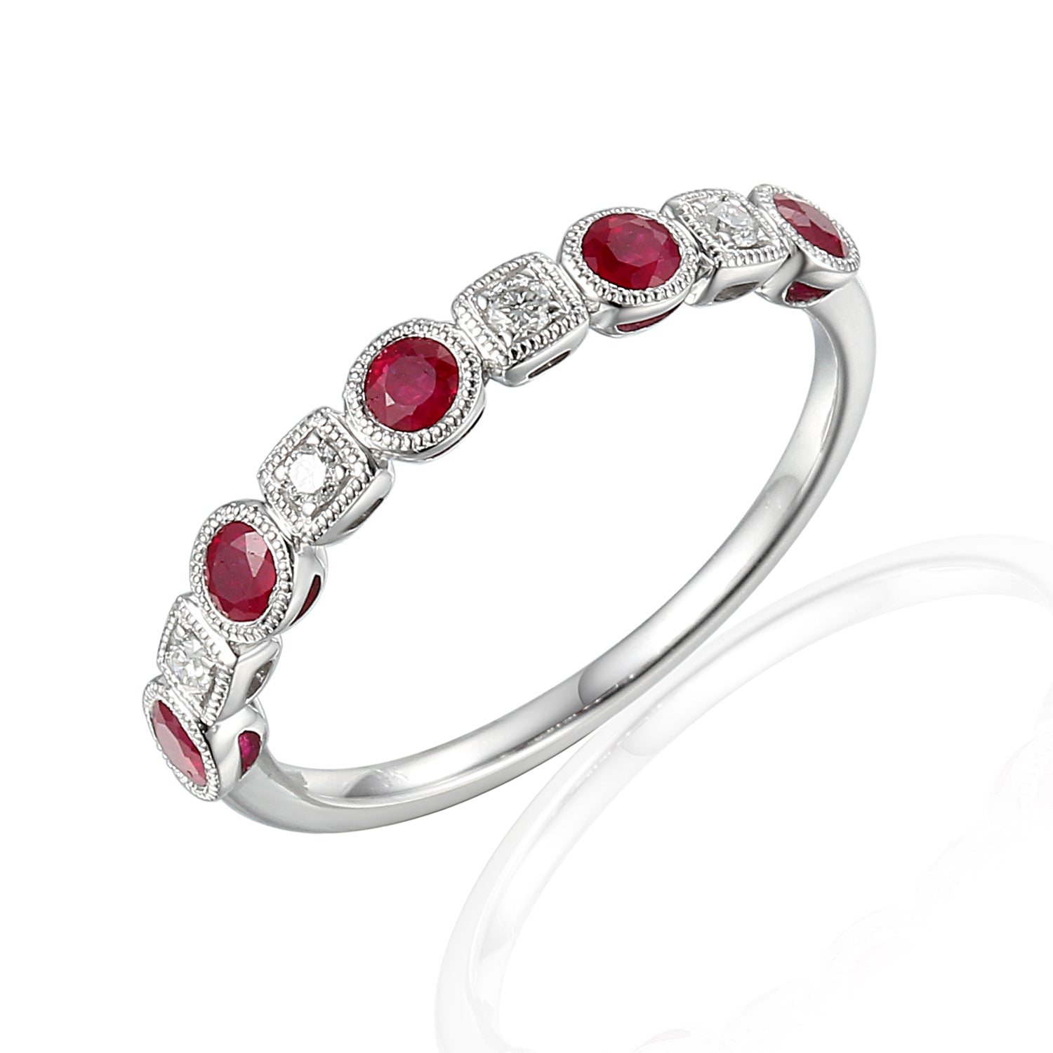9WG ALTERNATING ROUND AND SQUARE LINKS RING SET WITH RBC 4=0.05ct WH PQ AND 5x2.5MM ROUND CUT RUBIES