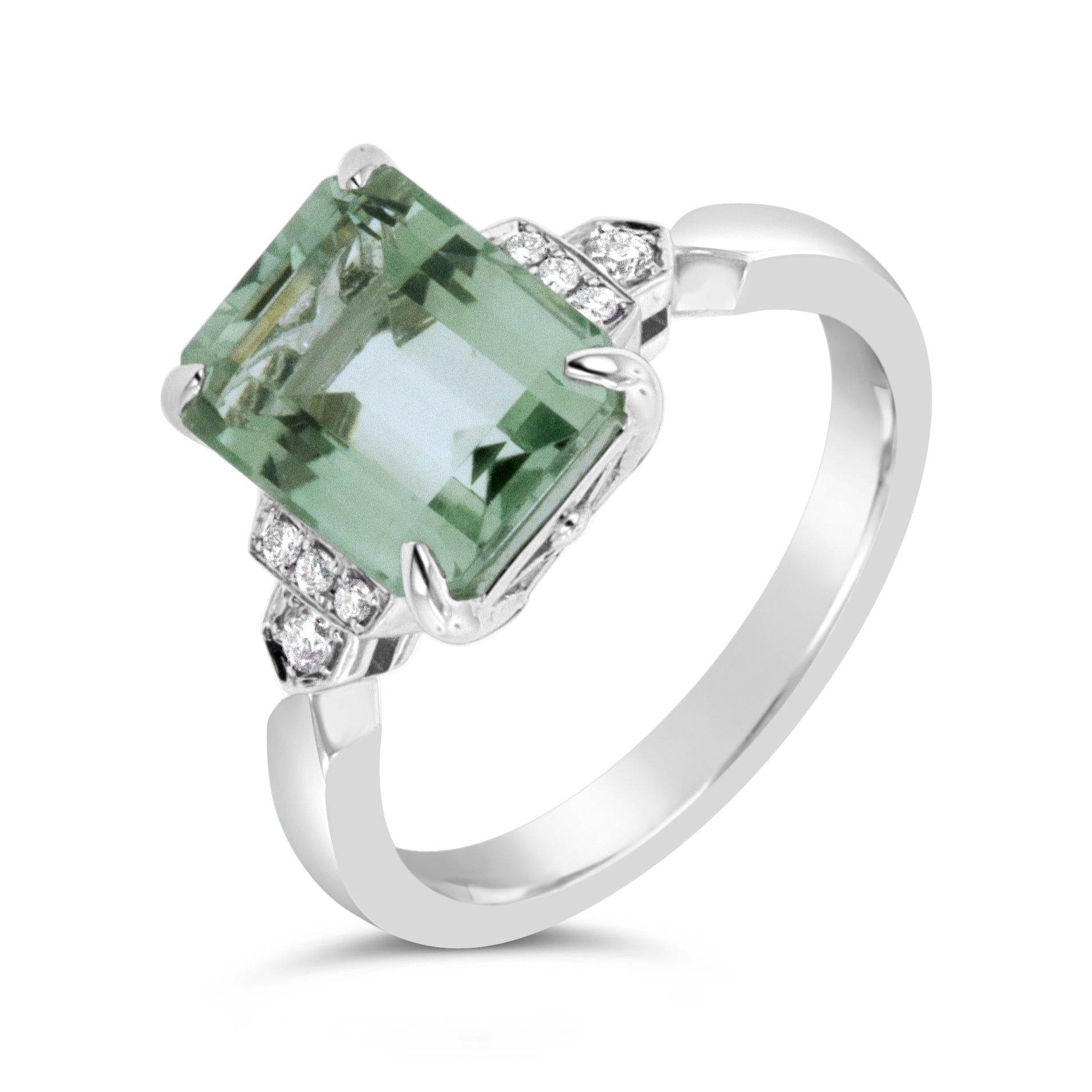 9WG 10X8mm EMERALD CUT GREEN AMETHYST RING SET WITH RBC 8=0.08CT WH PQ