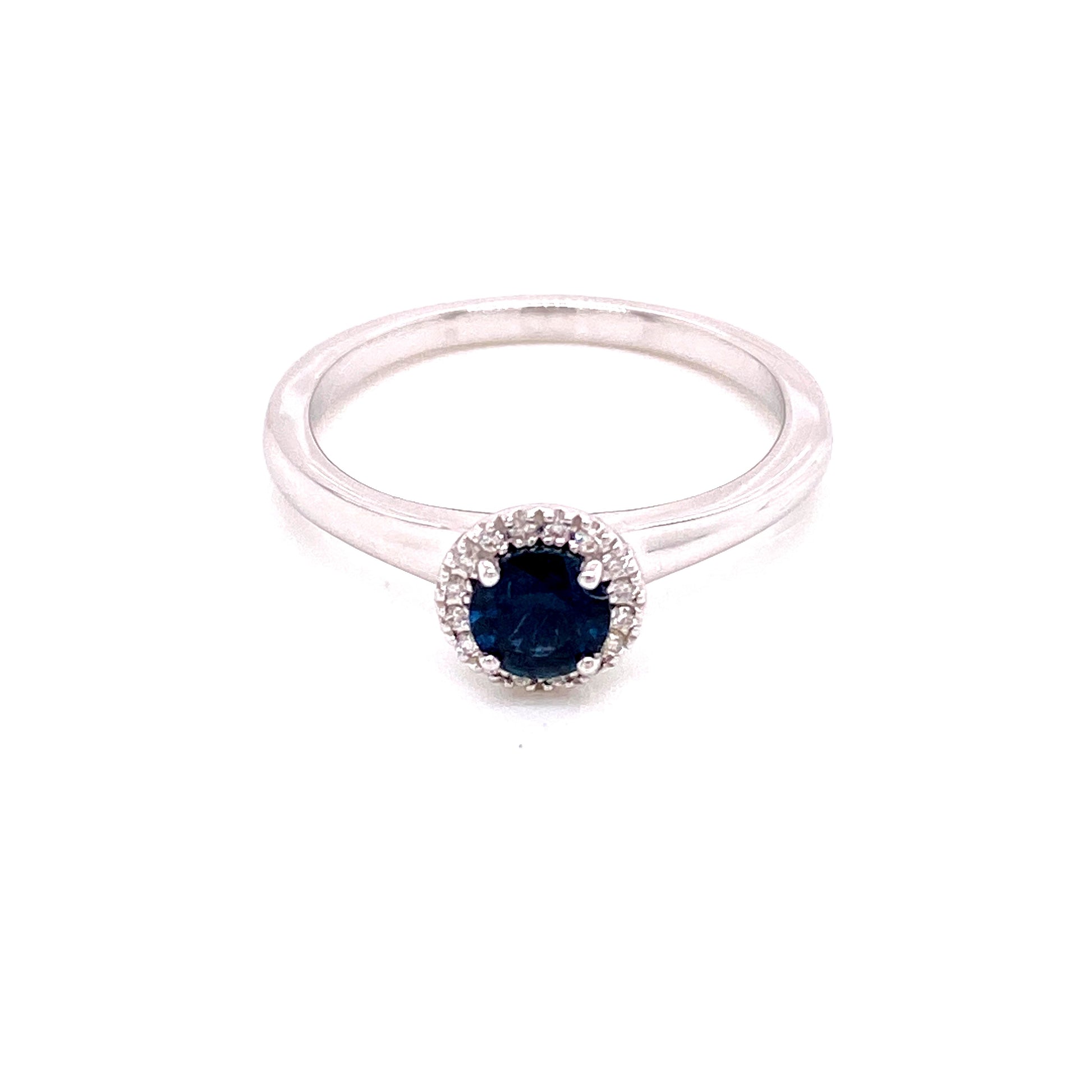 9WG FINE HALO RING WITH TAPERED PLAIN BAND 16=0.04CT WH PQ SET WITH BLUE SAPPHIRE APPROX 4.50MM ROUND CTR
