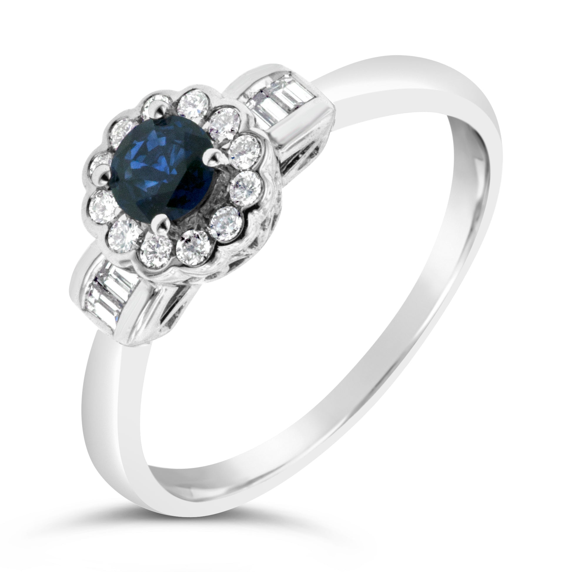 9WG BLUE SAPPHIRE ANTIQUE RING WITH ROUNDS AND BAG DIAMONDS 16=0.20CT WH PQ