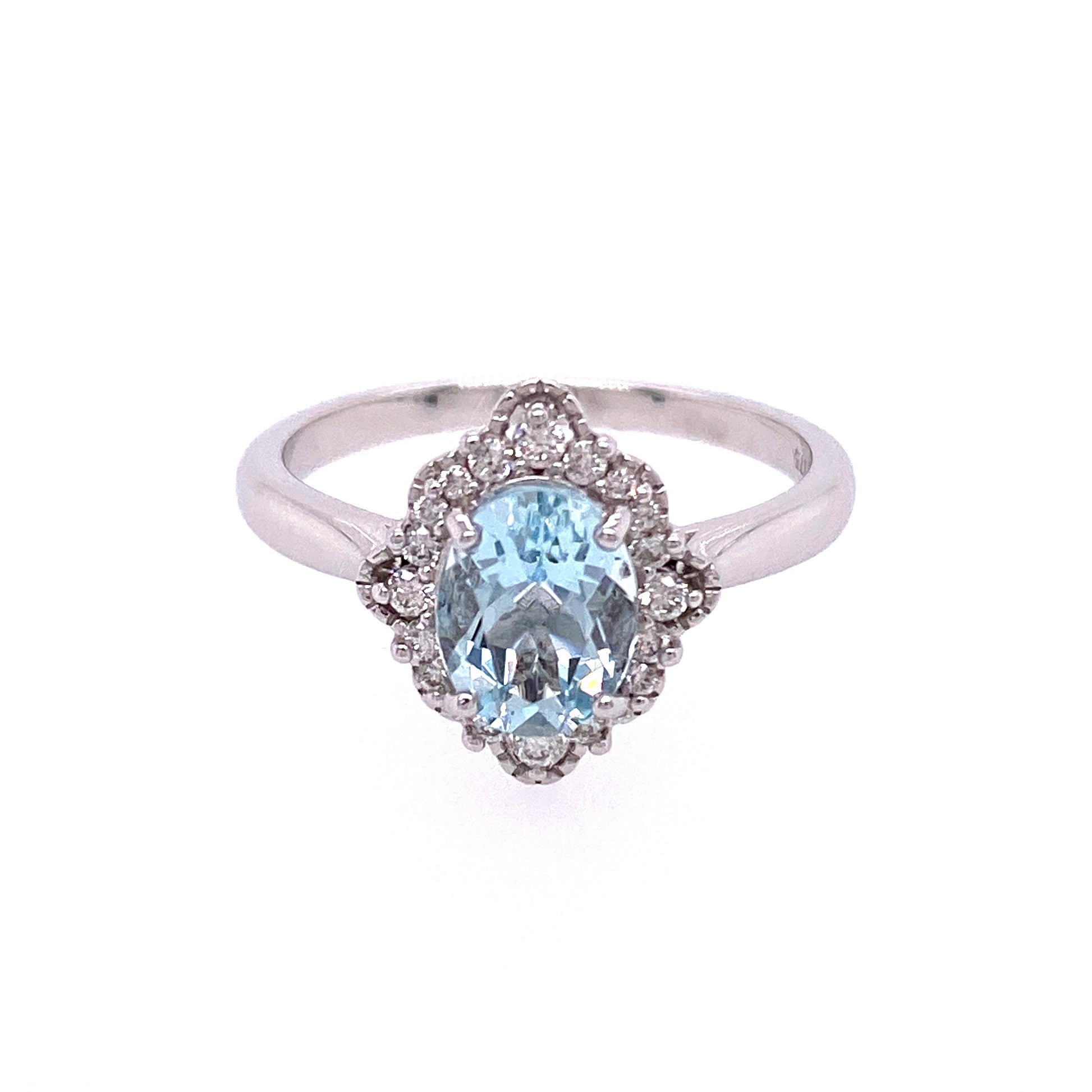9WG 8x6MM OVAL CUT AQUAMARINE ANTIQUE STYLE RING SET WITH RBC 20=0.15CT WH PQ
