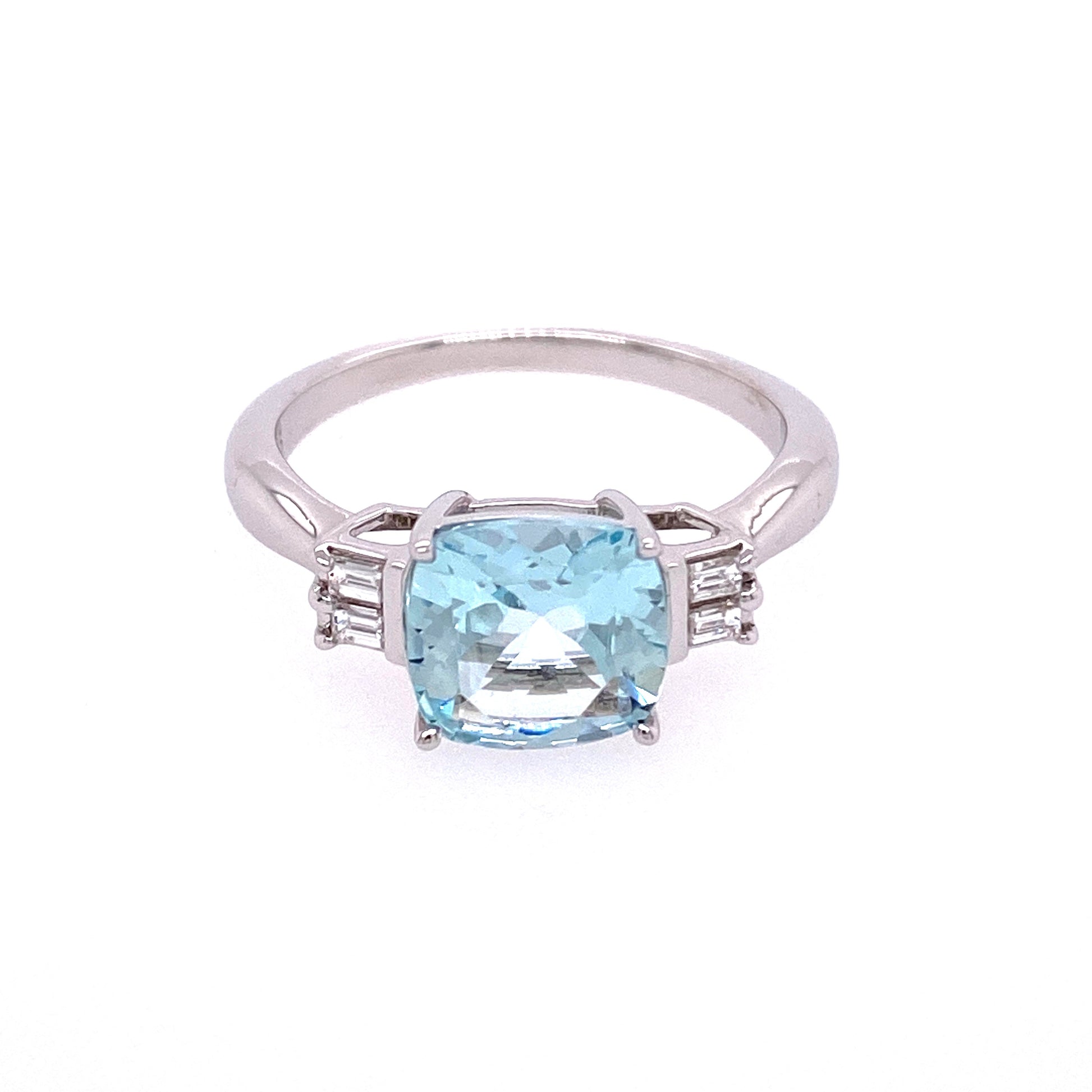 9WG 8MM CUSHION AQUAMARINE DRESS RING WITH BAGUETTE SIDE STONES 4=0.10CT EFG+ VS+