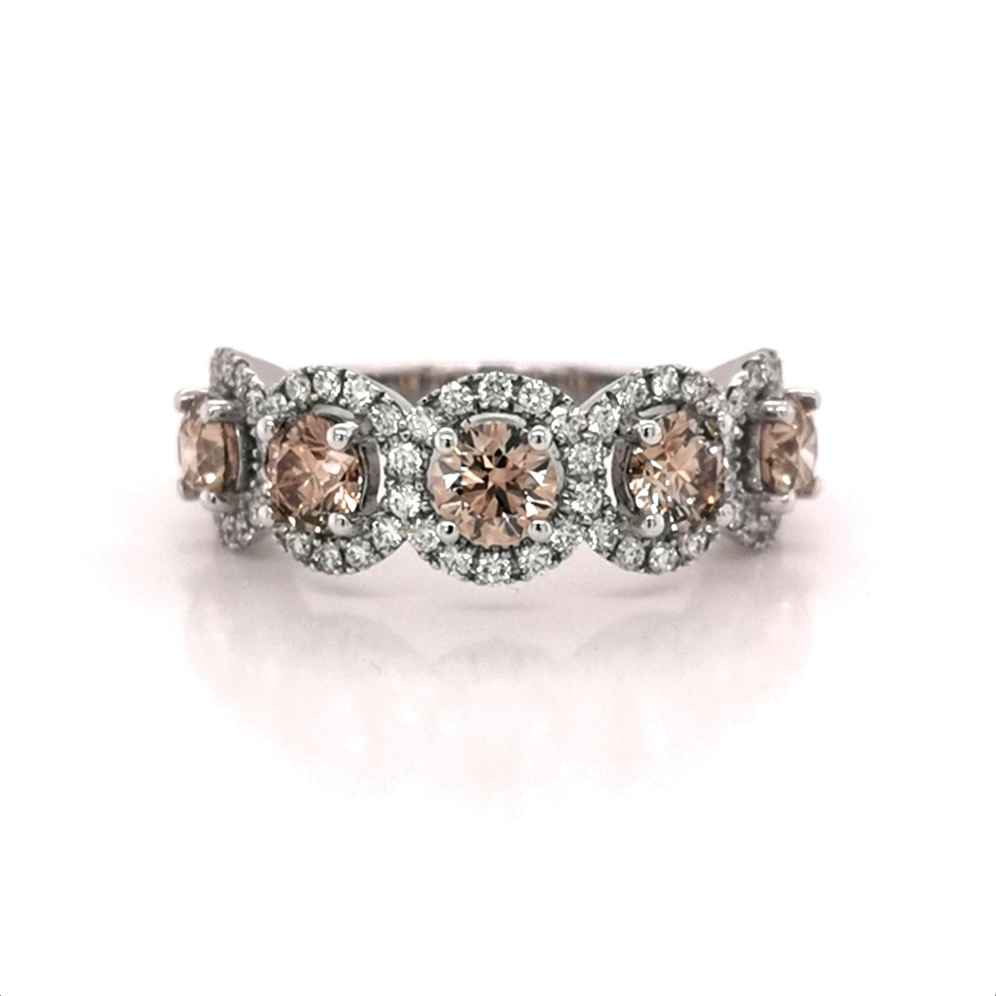 18WG MULTI HALO RING WITH WHITE DIA HALO, TCW 1.93CT, SET WITH CHAMPAGNE RBC 5=1.51CT C4 VS1 (2104031) ARGYLE NON & RBC 62=0.42CT WH SI