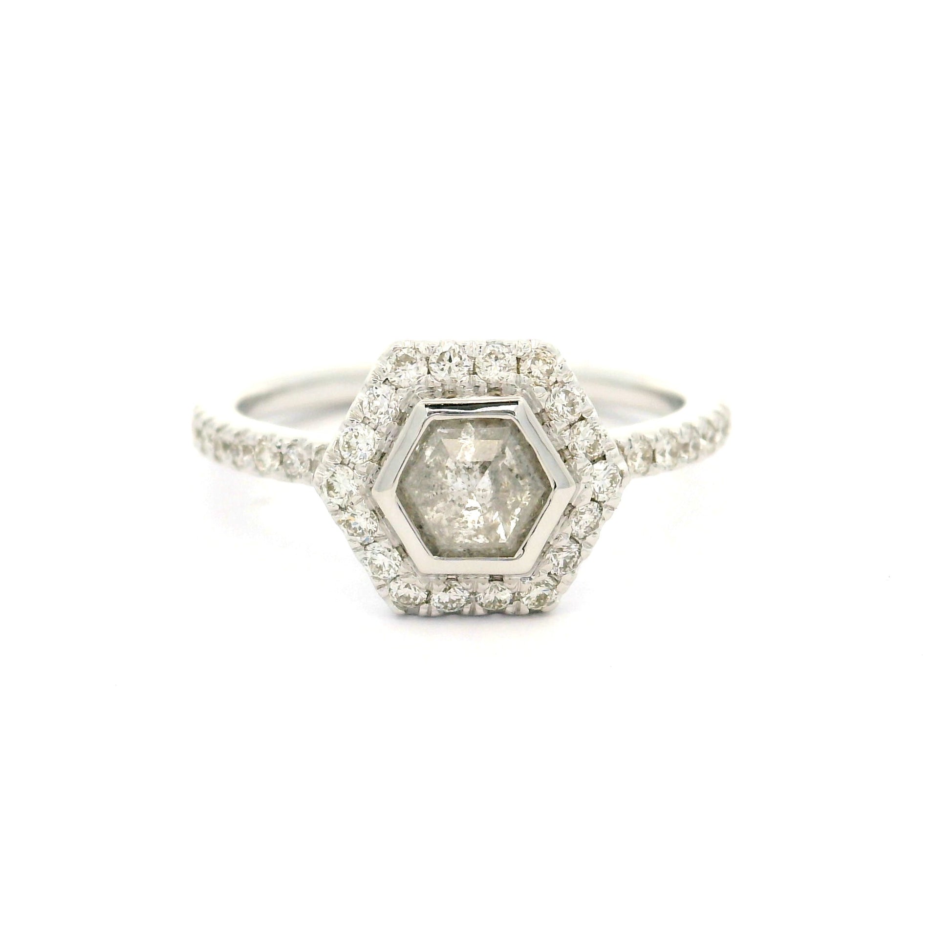 18WG HEXAGON DIAMOND SLICE RING 1=0.46CT WITH RBC HALO/SHOULDERS 34=0.32CT WH SI