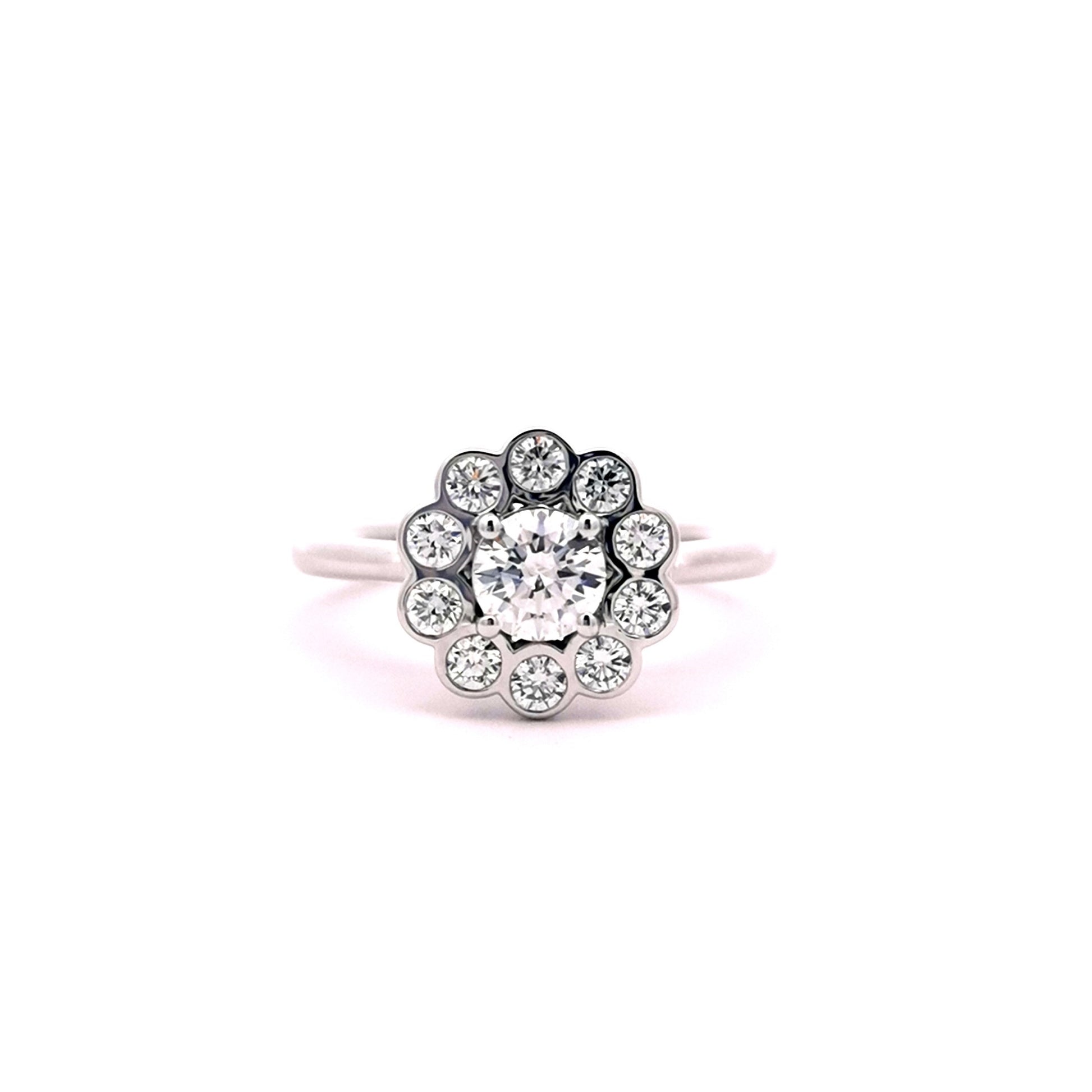 18WG BEZEL SET FLOWER HALO RING WITH RBC 1=0.50CT F SI2 (2303319) GIA & RBC 10=0.50CT WH SI