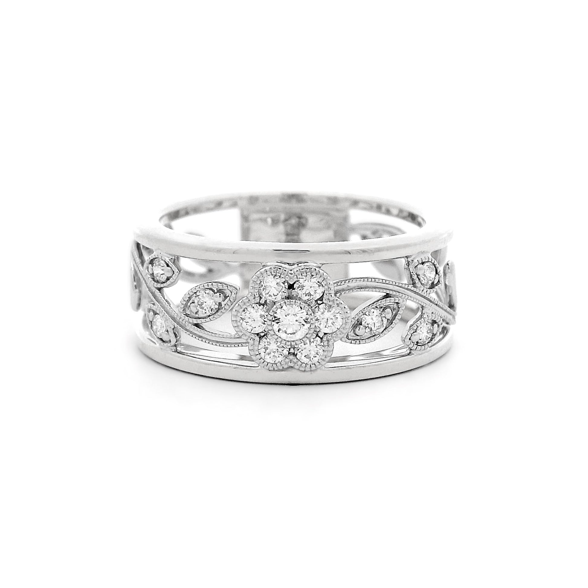 18WG OPEN FILIGREE FLORAL RING SET WITH RBC 13=0.25CT WH SI **SIZES K-T, NO 1/2 SIZES**