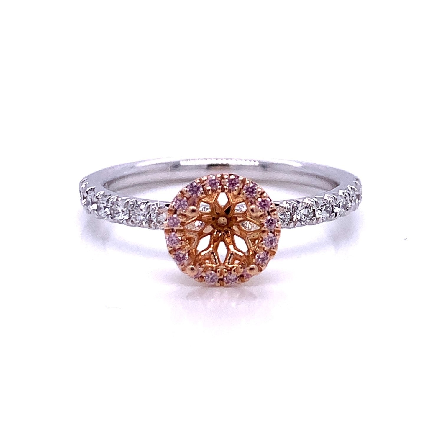**DNO * 2 LFT**18WRG HALO SEMI-MOUNT RING WITH SHOULDER DIAMONDS SET WITH RBC 16=0.28CT DEF VS-SI & RBC HALO 16=0.06CT 6-7P/PP ARGYLE 449265 TO TAKE 5.10MM RBC CENTRE **RG SETTING, WG SHANK** EXCLUDES S&F**