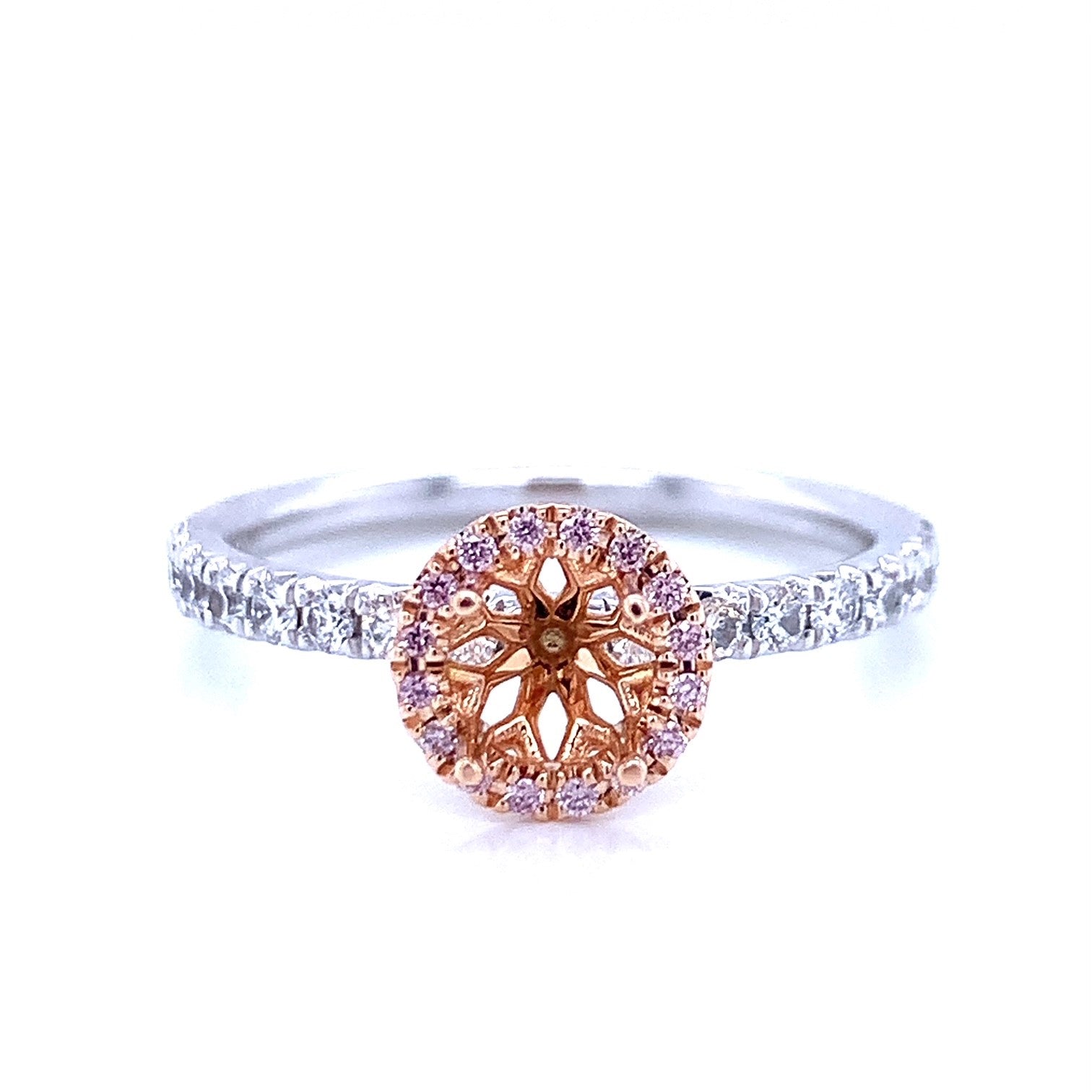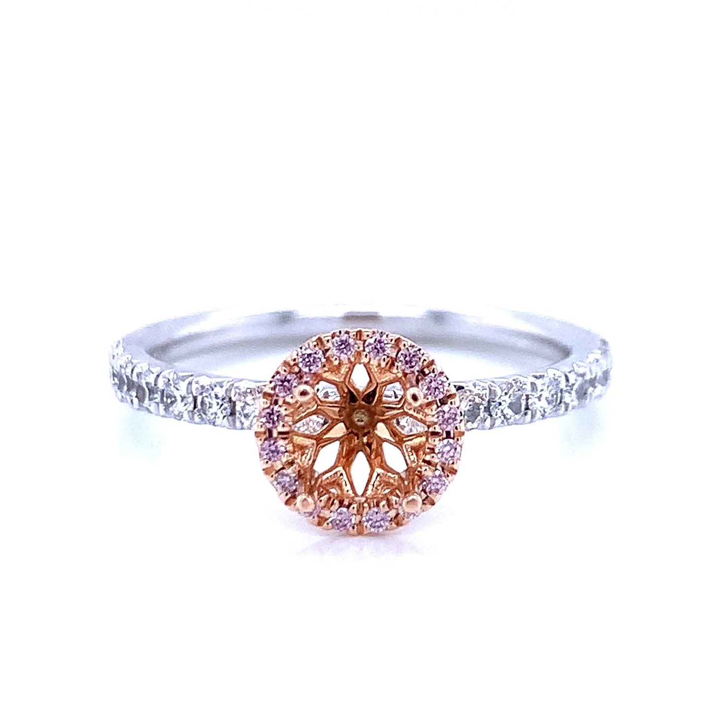 **LAST ONE**18WRG HALO SEMI-MOUNT RING WITH SHOULDER DIAMONDS SET WITH RBC 16=0.28CT DEF VS-SI & RBC HALO 16=0.06CT 6-7PR ARGYLE LOT#436284 TO TAKE 5.10MM RBC CENTRE **RG SETTING, WG SHANK** EXCLUDES S&F**