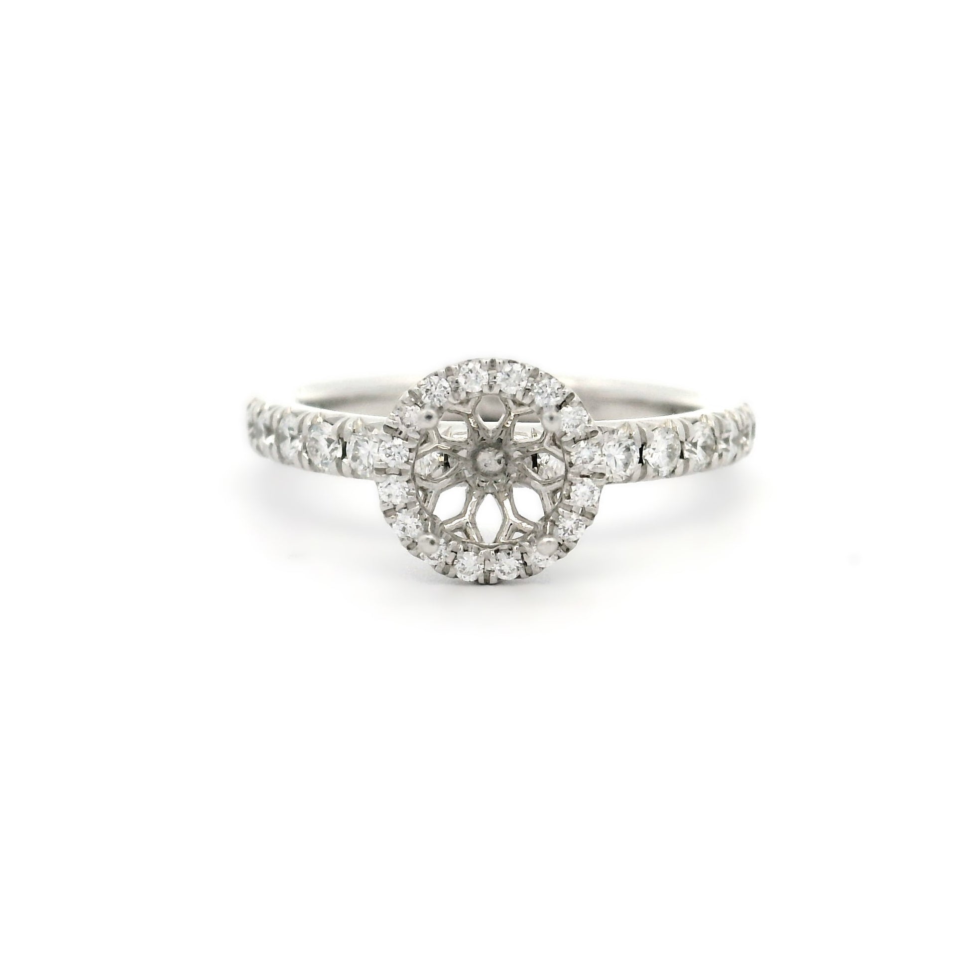 18YG HALO SEMI-MOUNT RING WITH SHOULDER DIAMONDS SET WITH RBC 32=0.50CT WH SI TO TAKE 6.40MM RBC CENTRE **EXCLUDES S&F**