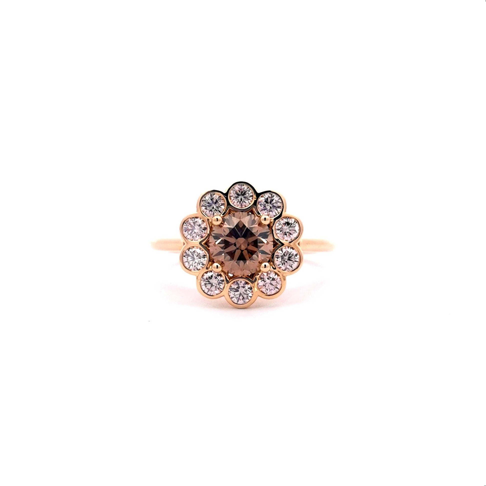 18YG SEMI-MOUNT RING FLOWER HALO DESIGN TO TAKE CENTER RBC 6.25MM-6.35MM SET WITH RUBBED IN HALO SET WITH RBC 10=0.60CT LPC LOT #459321 **EXCLUDES S&F**