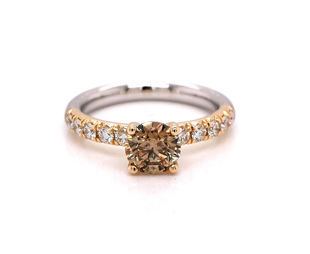 18YWG 4 CLAW RING WITH CLAW SET SHOULDER, CHAMPAGNE RBC 1=1.05CT C3 VS1 (2102160) AOR LAS AND RBC 10=0.40ct WH SI **YG SETTING/SHOULDER*WG SHANK**