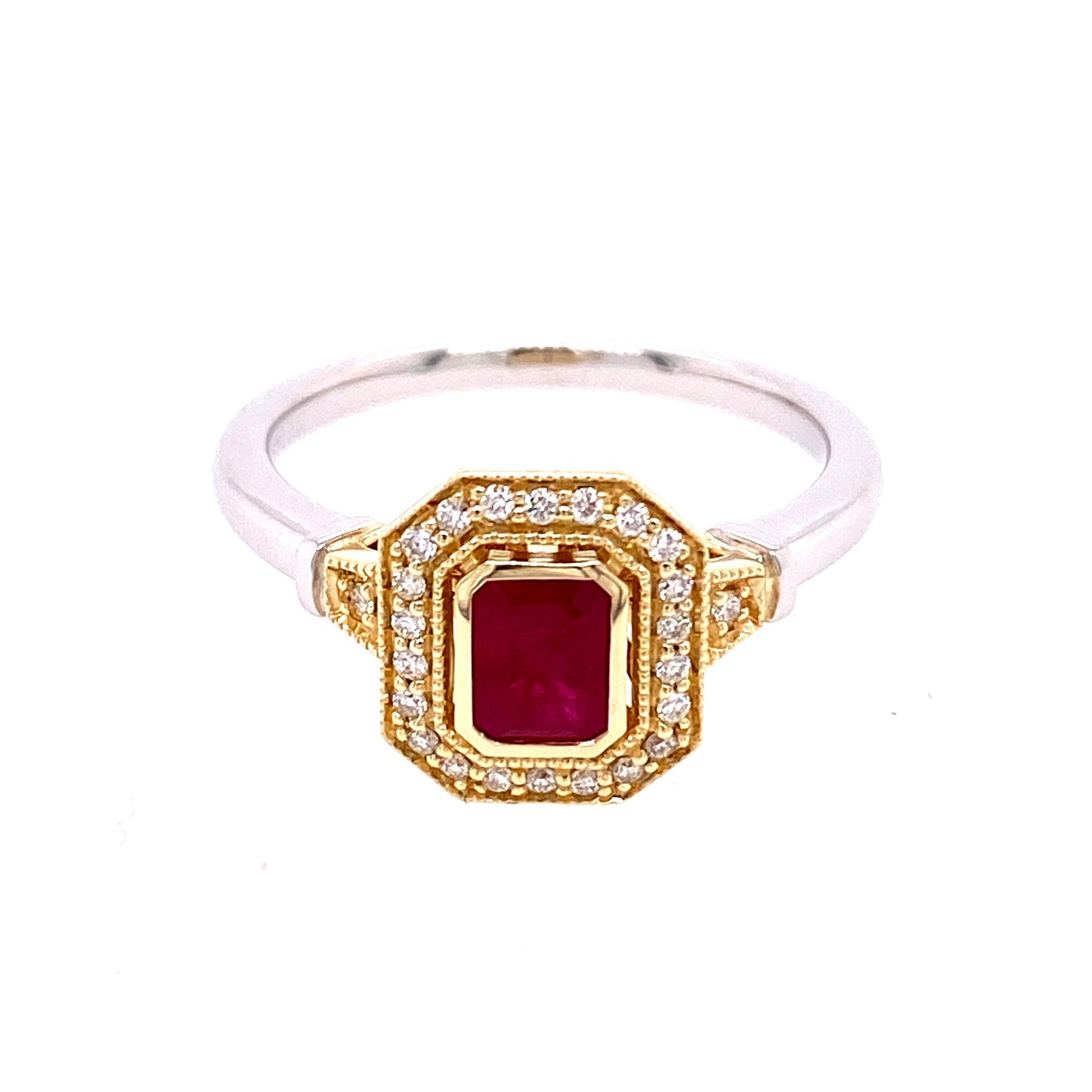 9YWG ART DECO EMERALD HALO RING SET WITH 5x4mm EMERALD CUT RUBY & RBC 24=0.10CT WH PQ **YG SETTING WG SHANK**