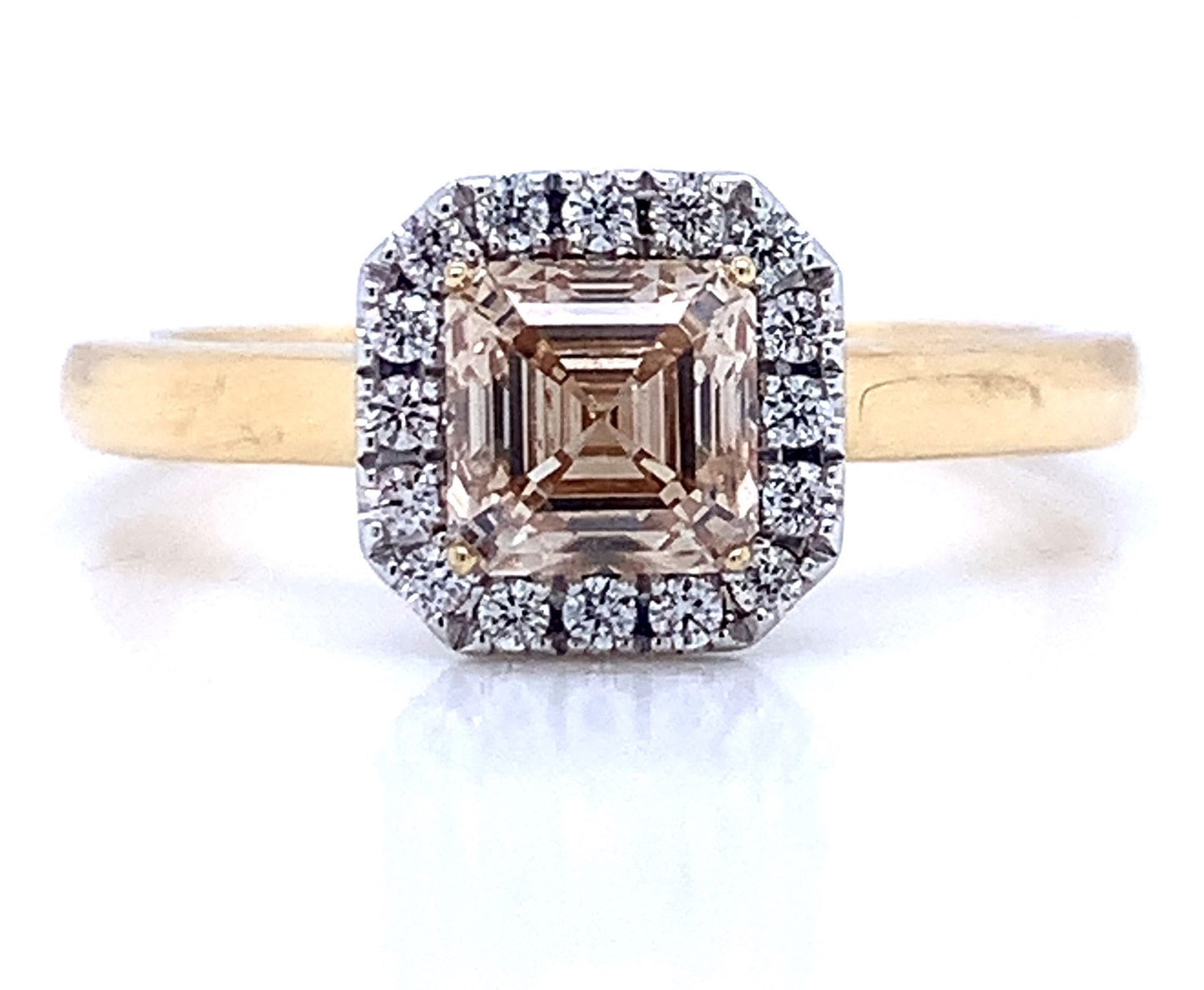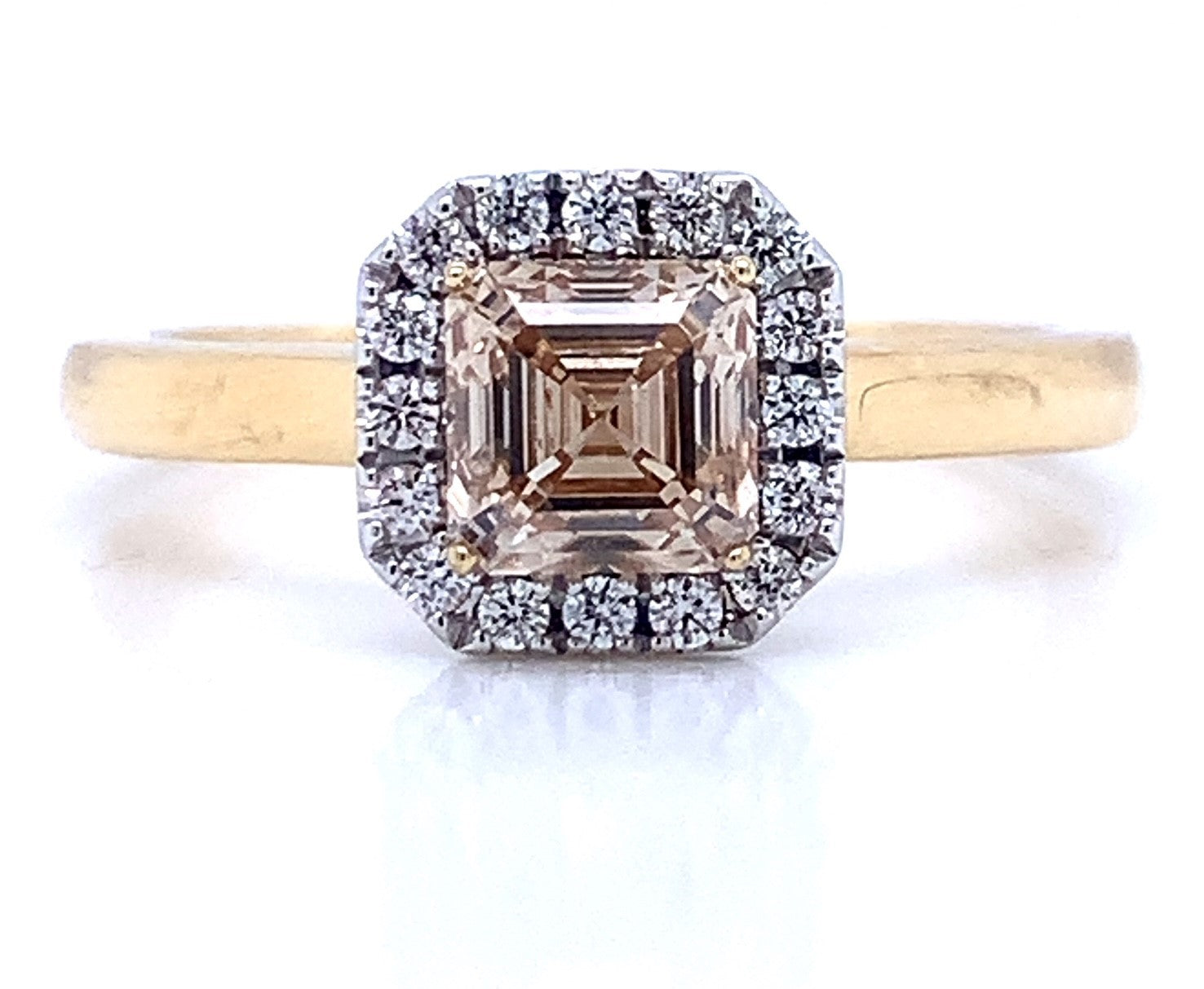 18YWG FINE HALO RING SET WITH CHAMPAGNE ASSCHER 1=1.02CT C1 SI2 (2201451) AOR & RBC 16=0.125CT NCL ARGYLE #459532 **WG HALO & YG CLAWS/BAND***