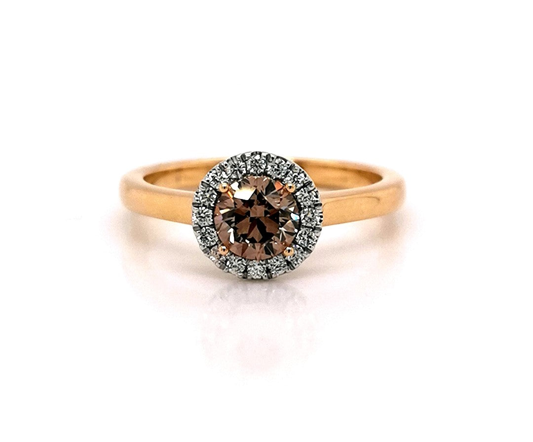 18YWG FINE HALO RING SET WITH CHAMPAGNE RBC 1=0.69CT C2 VS2 (2202365) AOR & RBC 16=0.12CT NCL ARGYLE #459532 **WG HALO & YG CLAWS/BAND**