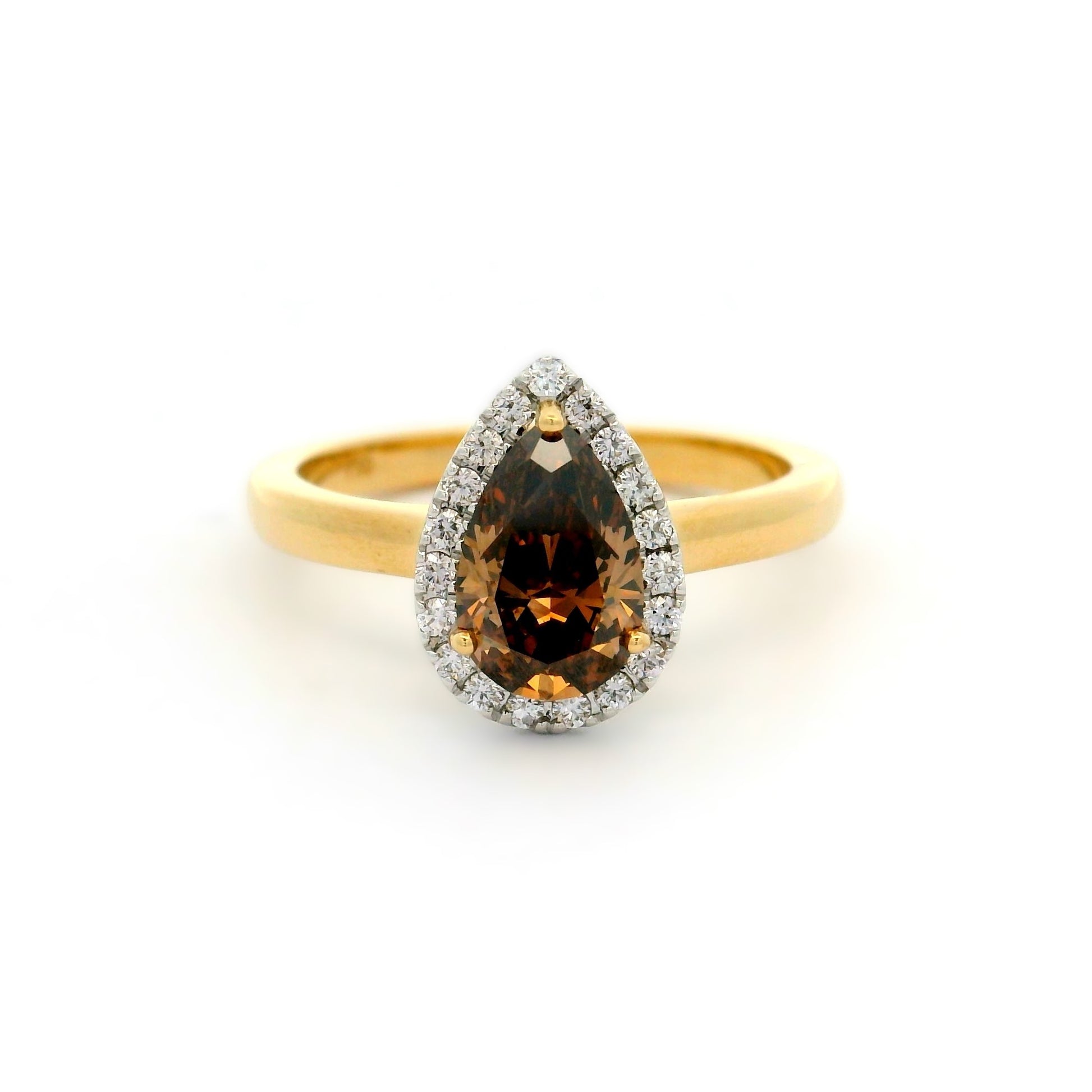 18YWG FINE HALO RING SET WITH CHAMPAGE PEAR 1=1.09CT C7 VVS2 (2303501) SGL Las & RBC 19=0.13CT NCL ARGYLE #459532 **WG HALO & YG CLAW/BAND**