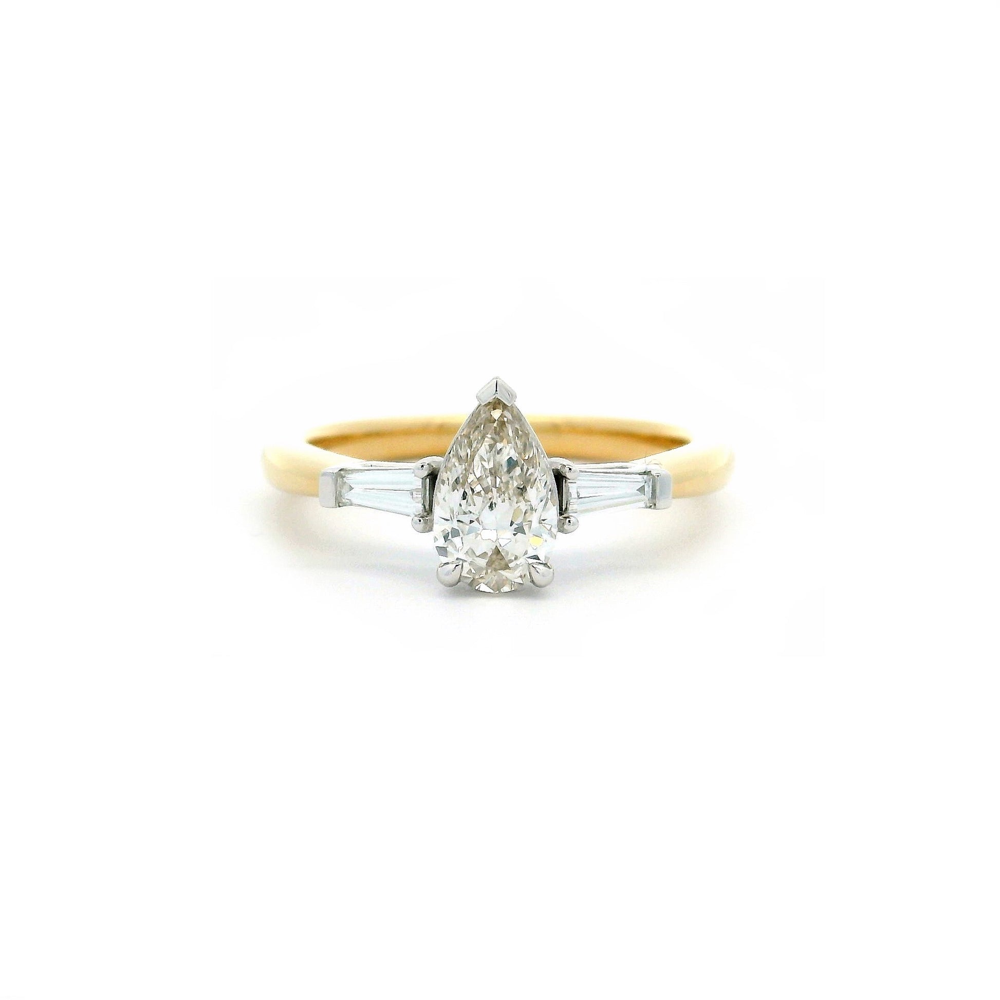 18YWG TRILOGY RING WITH V/CLAW SET CHAMPAGNE PEAR 1=0.71CT C1 SI2 (2312414) SGL & BAR/CLAW TAPER BGT 2=0.13CT EF VS (2403776) **WG SETTING YG SHANK**